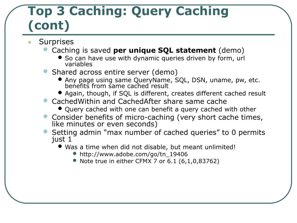 Top 3 Caching: Query Caching (cont) • Surprises • Caching is saved per unique SQL statement (demo) • So can have use with dynamic queries driven by form, url variables • Shared across entire server (demo) • Any page using same QueryName, SQL, DSN, uname, pw, etc. benefits from same cached result • Again, though, if SQL is different, creates different cached result • CachedWithin and CachedAfter share same cache • Query cached with one can benefit a query cached with other • Consider benefits of micro-caching (very short cache times, like minutes or even seconds) • Setting admin “max number of cached queries” to 0 permits just 1 • Was a time when did not disable, but meant unlimited! • http://www.adobe.com/go/tn_19406 • Note true in either CFMX 7 or 6.1 (6,1,0,83762)
