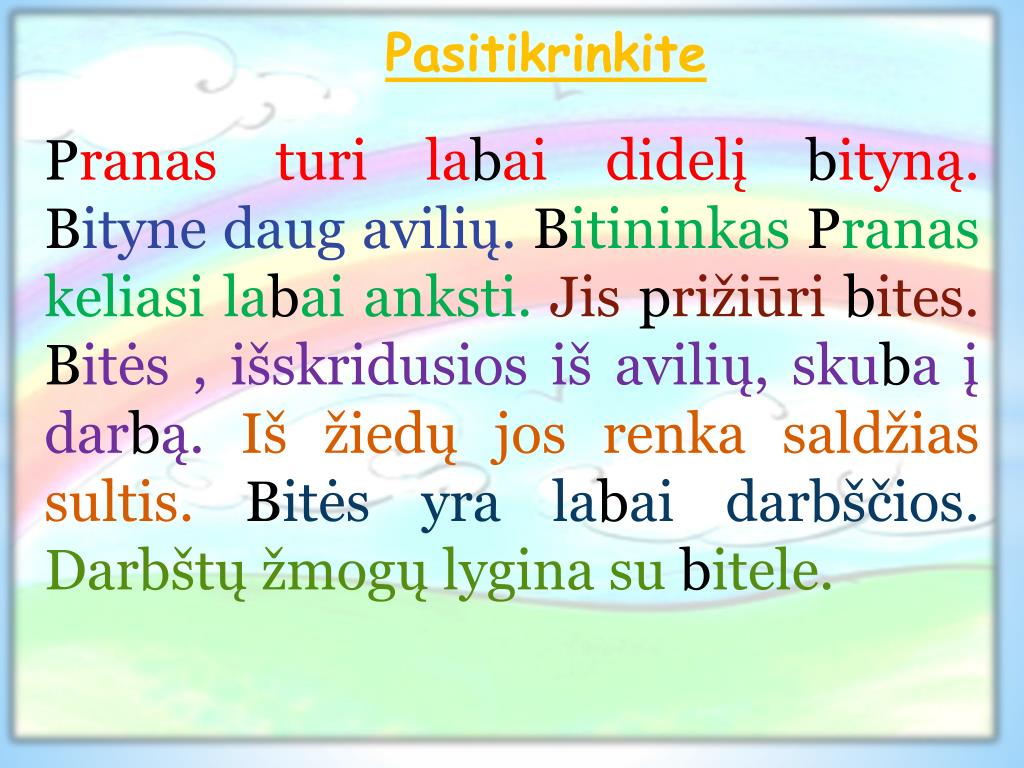 Pasitikrinkite Pranas turi labai didelį bityną. Bityne daug avilių. Bitininkas Pranas keliasi labai anksti.Jis prižiūri bites. Bitės , išskridusios iš avilių, skuba į darbą. Iš žiedų jos renka saldžias sultis. Bitės yra labai darbščios.Darbštų žmogų lygina su bitele.