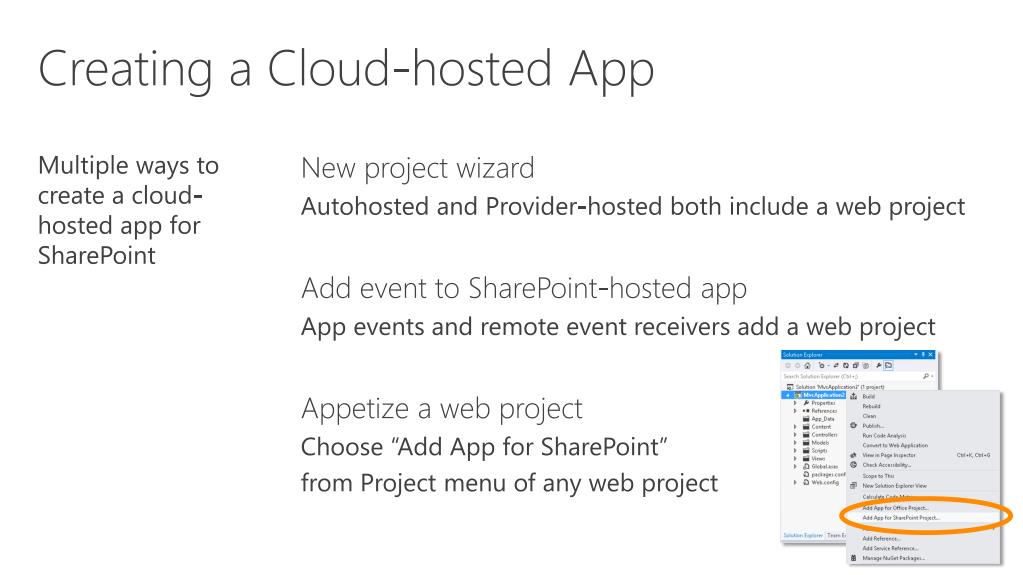 Creating a Cloud-hosted App • Multiple ways to create a cloud-hosted app for SharePoint • New project wizard • Autohosted and Provider-hosted both include a web project • Add event to SharePoint-hosted app • App events and remote event receivers add a web project • Appetize a web project • Choose “Add App for SharePoint” • from Project menu of any web project