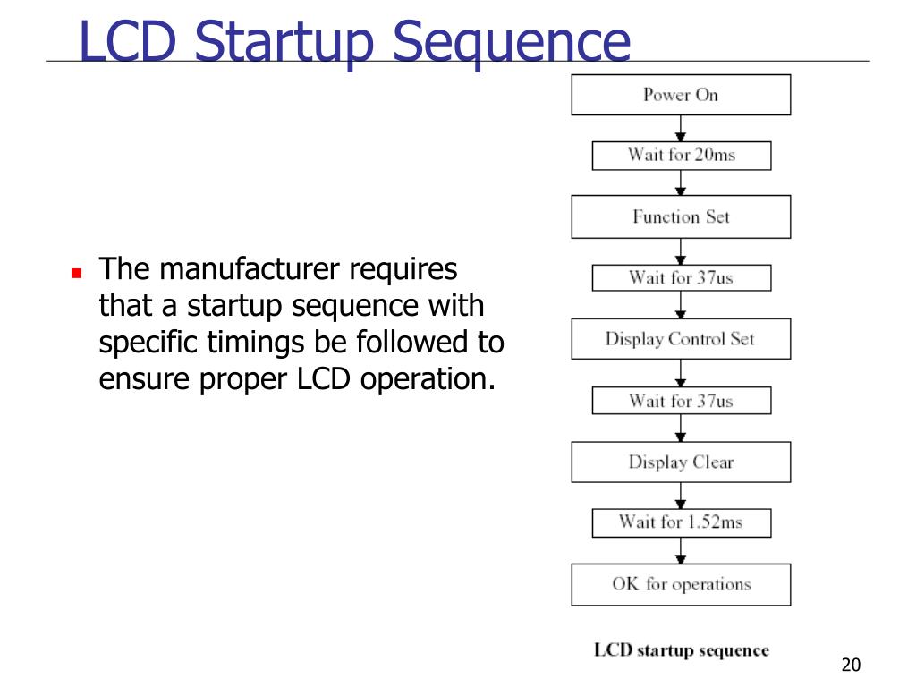 LCD Startup Sequence • The manufacturer requires that a startup sequence with specific timings be followed to ensure proper LCD operation.