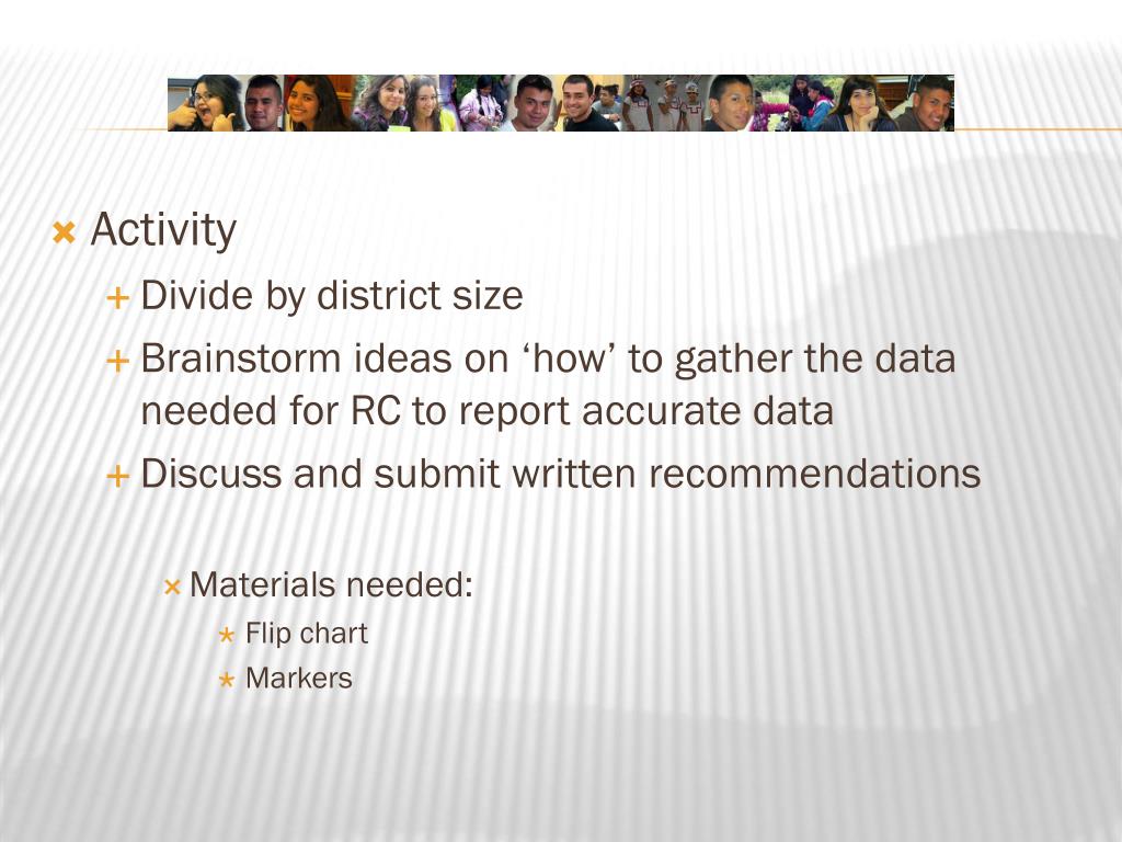 Activity • Divide by district size • Brainstorm ideas on ‘how’ to gather the data needed for RC to report accurate data • Discuss and submit written recommendations • Materials needed: • Flip chart • Markers