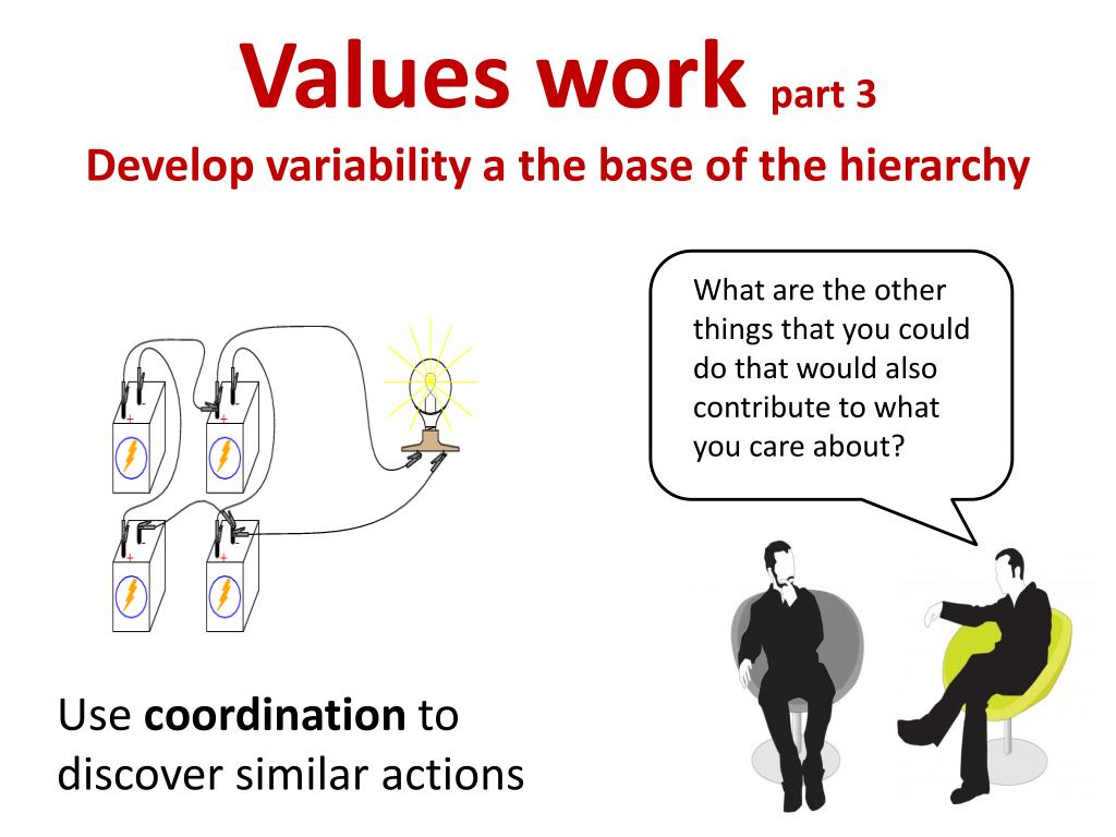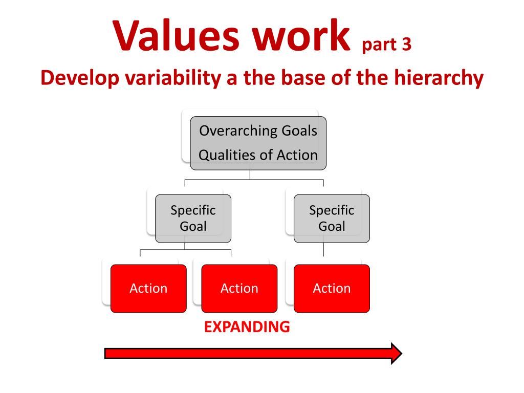 Values work part 3Develop variability a the base of the hierarchy Use coordination to discover similar actions What are the other things that you could do that would also contribute to what you care about?