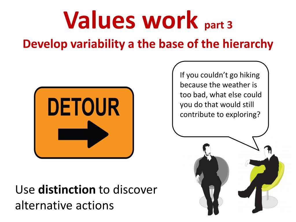 Values work part 3Develop variability a the base of the hierarchy Use distinction to discover alternative actions If you couldn’t go hiking because the weather is too bad, what else could you do that would still contribute to exploring?
