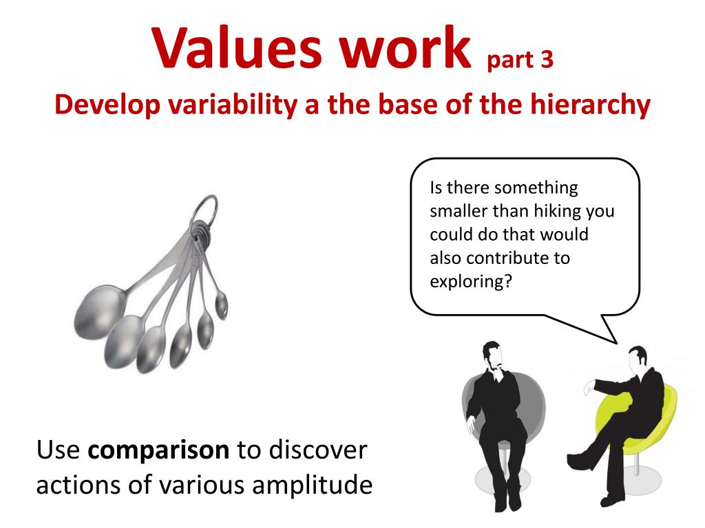 Values work part 3Develop variability a the base of the hierarchy Use comparison to discover actions of various amplitude Is there something smaller than hiking you could do that would also contribute to exploring?