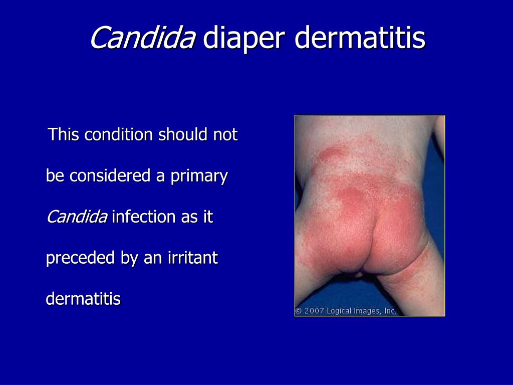 Candida diaper dermatitis This condition should not be considered a primary Candida infection as it preceded by an irritant dermatitis