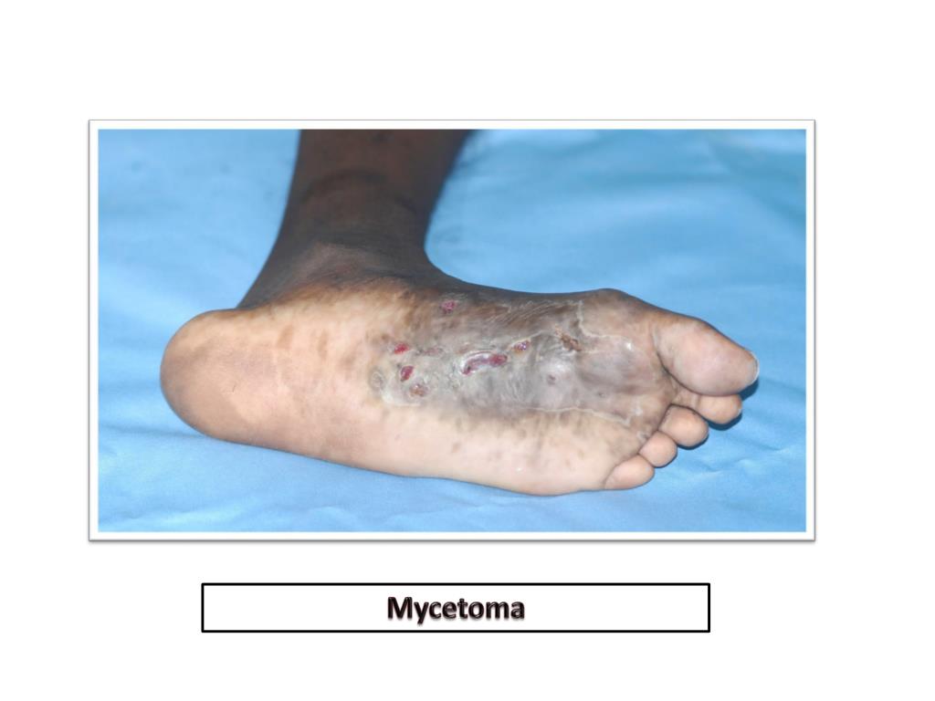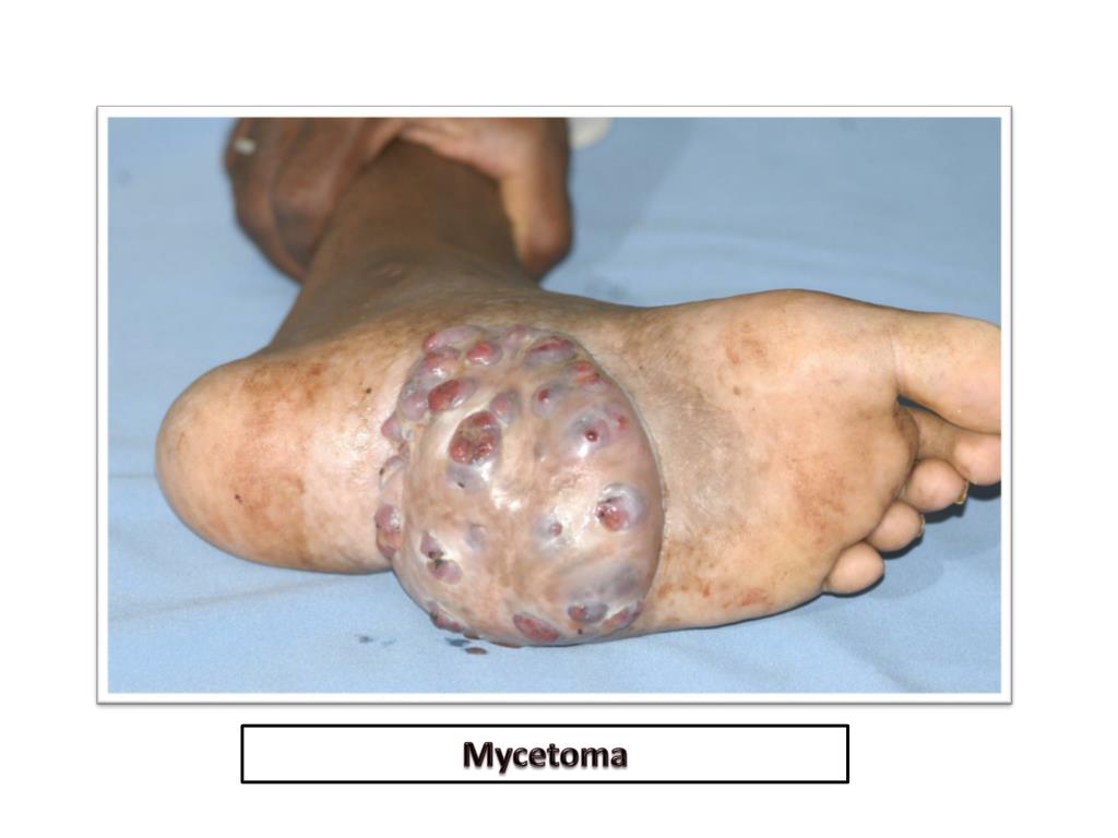 Subcutaneous Mycoses • Skin, subcutaneous tissues, fascia and bone • Localized • Trauma • More in tropics • Mycetoma, chromomycosis and sporotrichosis