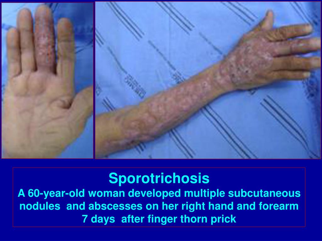 Sporotrichosis A 60-year-old woman developed multiple subcutaneous nodules and abscesses on her right hand and forearm 7 days after finger thorn prick
