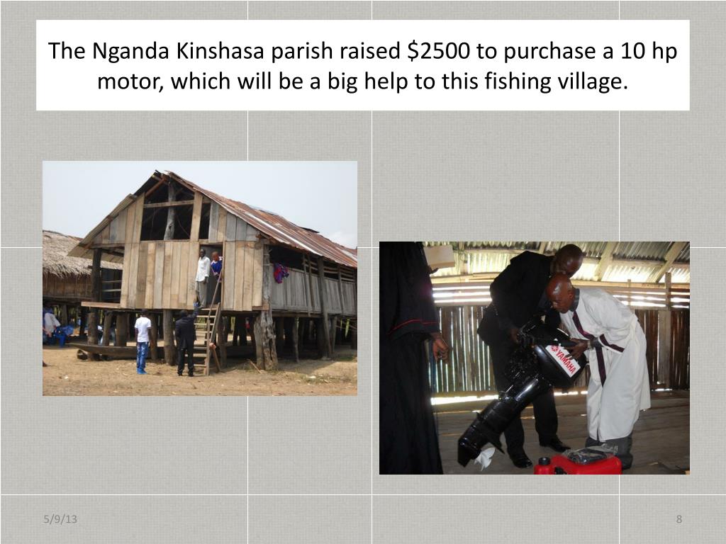 The Nganda Kinshasa parish raised $2500 to purchase a 10 hp motor, which will be a big help to this fishing village.