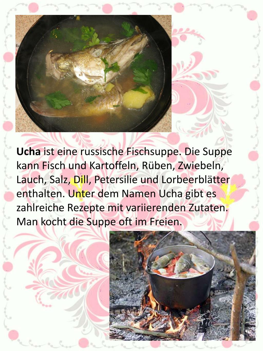 Ucha ist eine russische Fischsuppe. Die Suppe kann Fisch und Kartoffeln, Rüben, Zwiebeln, Lauch, Salz, Dill, Petersilie und Lorbeerblätter enthalten. Unter dem Namen Ucha gibt es zahlreiche Rezepte mit variierenden Zutaten. Man kocht die Suppe oft im Freien.