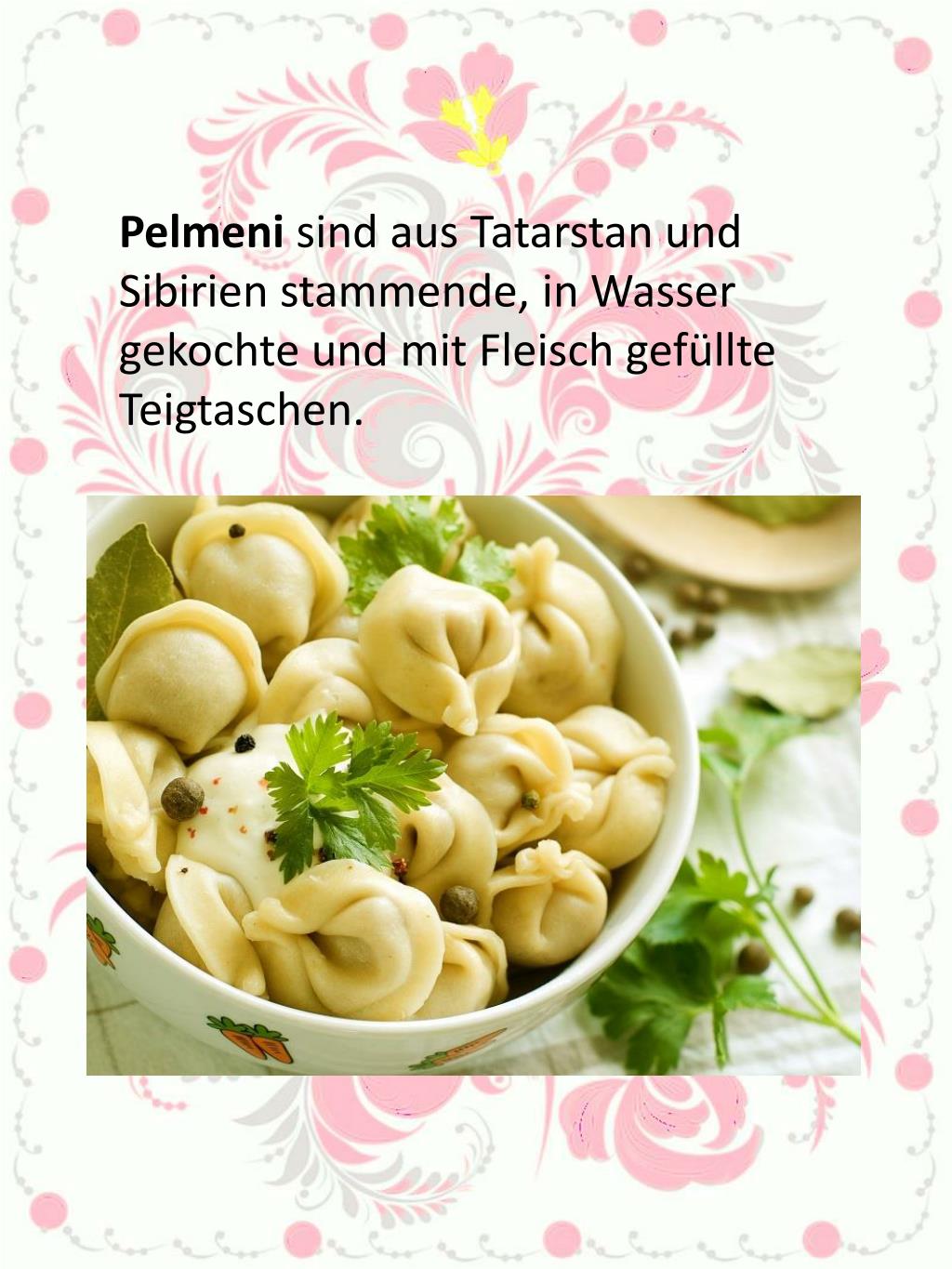 Pelmeni sind aus Tatarstan und Sibirien stammende, in Wasser gekochte und mit Fleisch gefüllte Teigtaschen.