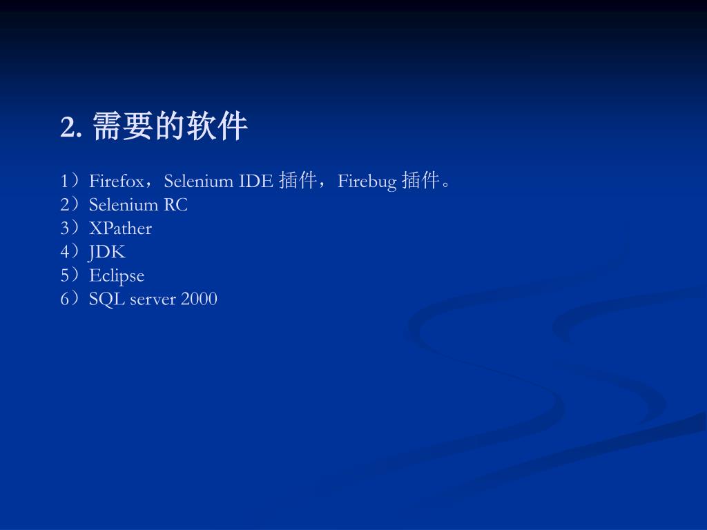 2. 需要的软件1)Firefox,Selenium IDE 插件,Firebug 插件。2)Selenium RC3)XPather4)JDK5)Eclipse6)SQL server 2000