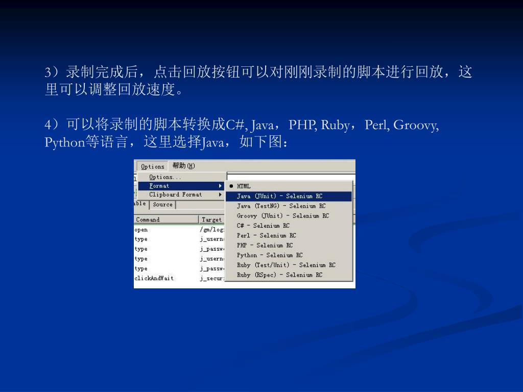 3)录制完成后,点击回放按钮可以对刚刚录制的脚本进行回放,这里可以调整回放速度。 4)可以将录制的脚本转换成C#, Java,PHP, Ruby,Perl, Groovy, Python等语言,这里选择Java,如下图:
