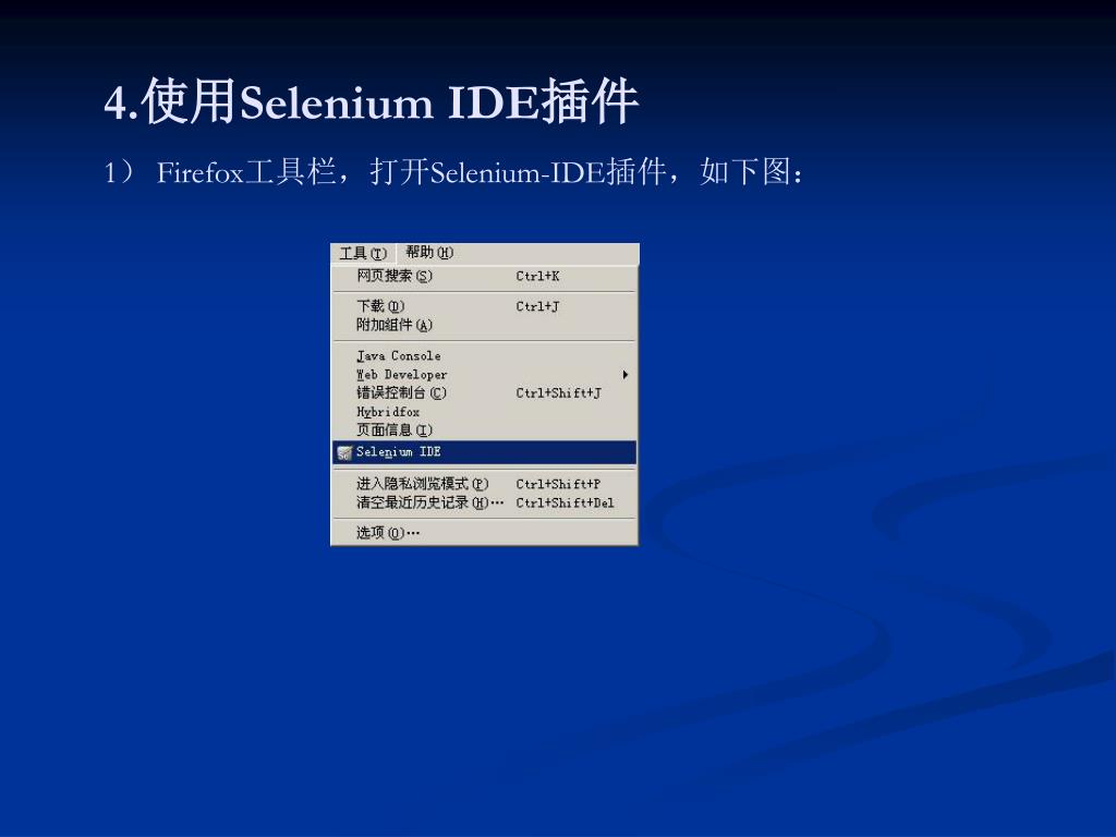 4.使用Selenium IDE插件1) Firefox工具栏,打开Selenium-IDE插件,如下图: