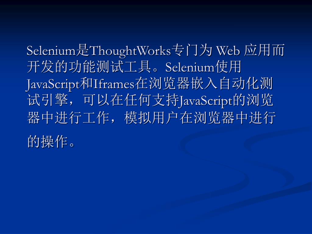 Selenium是ThoughtWorks专门为 Web 应用而开发的功能测试工具。Selenium使用JavaScript和Iframes在浏览器嵌入自动化测试引擎,可以在任何支持JavaScript的浏览器中进行工作,模拟用户在浏览器中进行的操作。