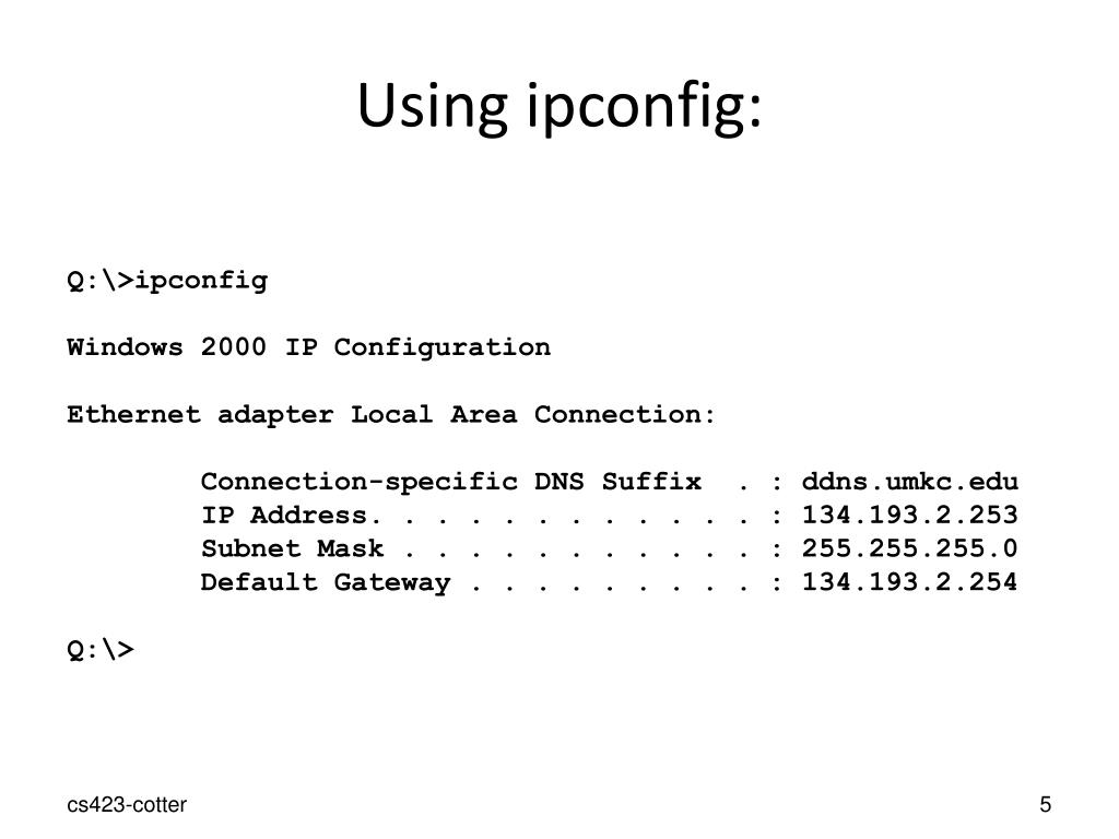 Using ipconfig: Q:\>ipconfig Windows 2000 IP Configuration Ethernet adapter Local Area Connection: Connection-specific DNS Suffix . : ddns.umkc.edu IP Address. . . . . . . . . . . . : 134.193.2.253 Subnet Mask . . . . . . . . . . . : 255.255.255.0 Default Gateway . . . . . . . . . : 134.193.2.254 Q:\> cs423-cotter 5