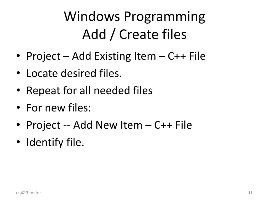 Windows ProgrammingAdd / Create files • Project – Add Existing Item – C++ File • Locate desired files. • Repeat for all needed files • For new files: • Project -- Add New Item – C++ File • Identify file.