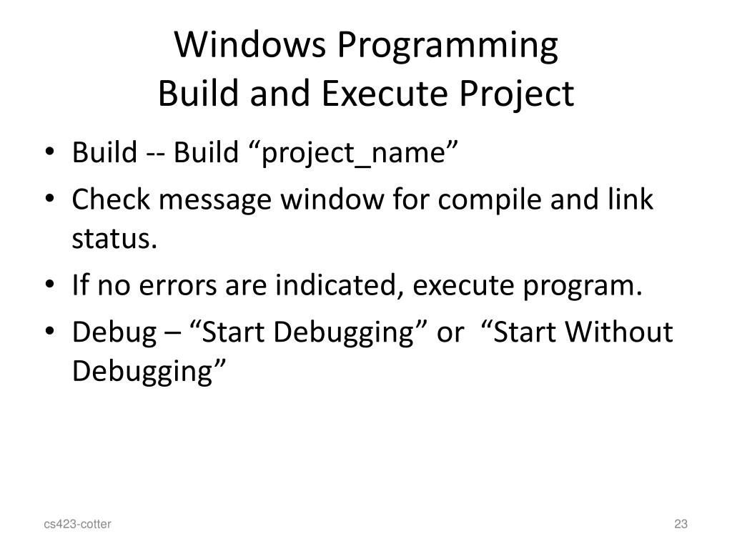 Windows ProgrammingBuild and Execute Project • Build -- Build “project_name” • Check message window for compile and link status. • If no errors are indicated, execute program. • Debug – “Start Debugging” or “Start Without Debugging”