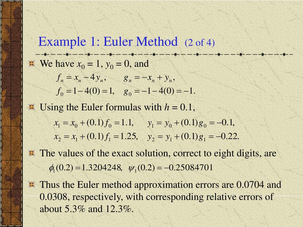 Example 1: Euler Method (2 of 4) • We have x0 = 1, y0 = 0, and • Using the Euler formulas with h = 0.1, • The values of the exact solution, correct to eight digits, are • Thus the Euler method approximation errors are 0.0704 and 0.0308, respectively, with corresponding relative errors of about 5.3% and 12.3%.