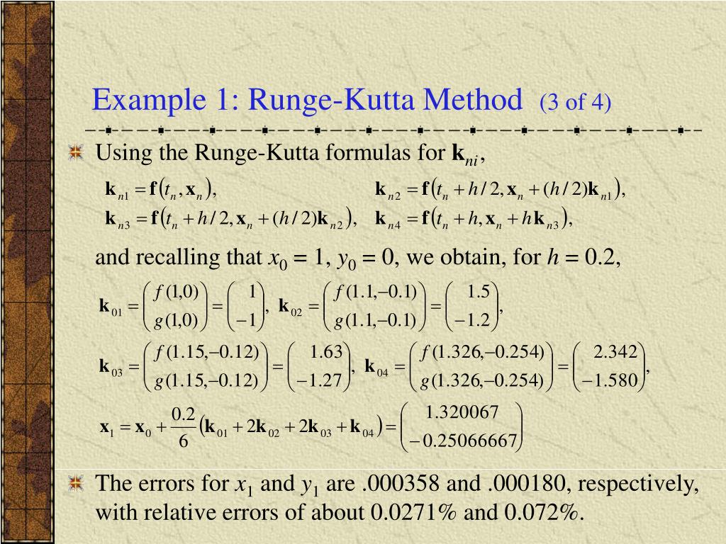 Example 1: Runge-Kutta Method (3 of 4) • Using the Runge-Kutta formulas for kni, and recalling that x0 = 1, y0 = 0, we obtain, for h = 0.2, • The errors for x1 and y1 are .000358 and .000180, respectively, with relative errors of about 0.0271% and 0.072%.