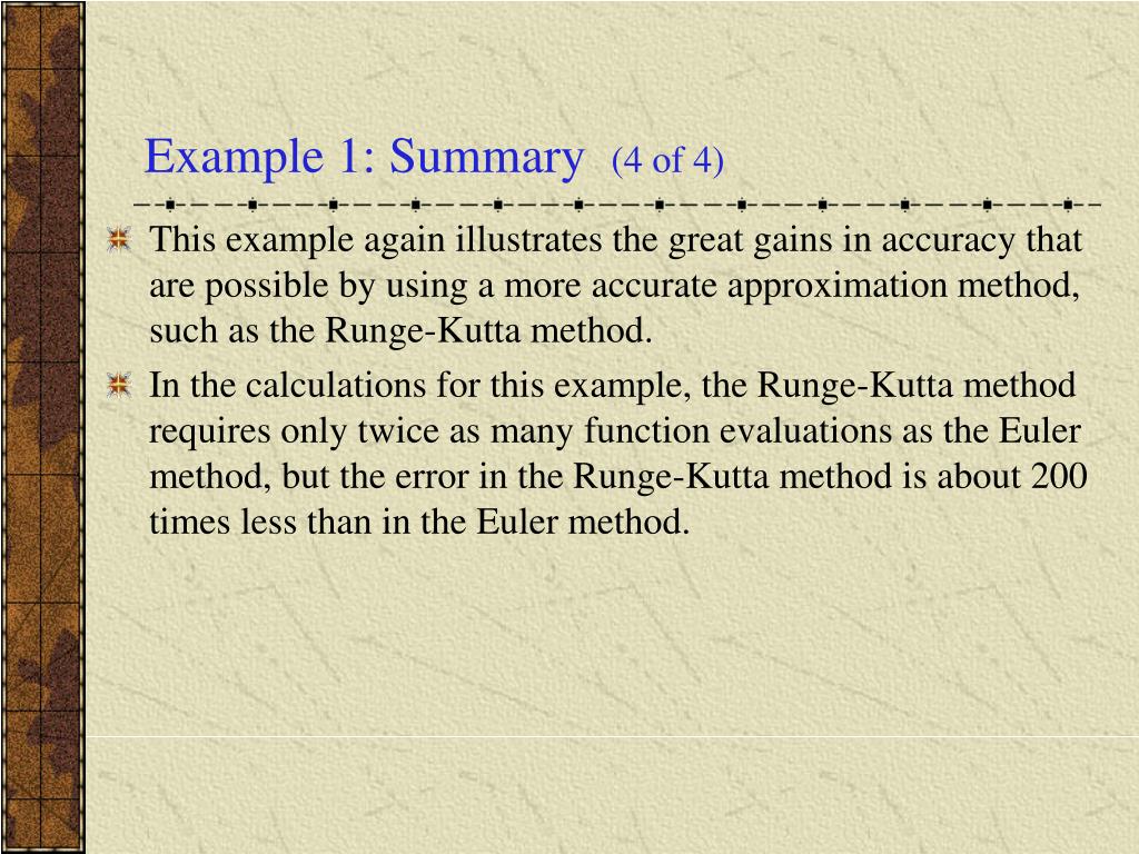 Example 1: Summary (4 of 4) • This example again illustrates the great gains in accuracy that are possible by using a more accurate approximation method, such as the Runge-Kutta method. • In the calculations for this example, the Runge-Kutta method requires only twice as many function evaluations as the Euler method, but the error in the Runge-Kutta method is about 200 times less than in the Euler method.