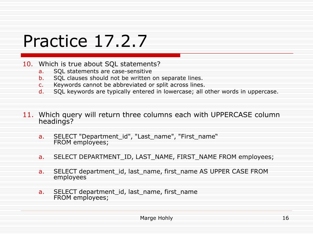 Practice 17.2.7 • Which is true about SQL statements? • SQL statements are case-sensitive • SQL clauses should not be written on separate lines. • Keywords cannot be abbreviated or split across lines. • SQL keywords are typically entered in lowercase; all other words in uppercase. • Which query will return three columns each with UPPERCASE column headings? • SELECT "Department_id", "Last_name", "First_name“FROM employees; • SELECT DEPARTMENT_ID, LAST_NAME, FIRST_NAME FROM employees; • SELECT department_id, last_name, first_name AS UPPER CASE FROM employees • SELECT department_id, last_name, first_nameFROM employees; Marge Hohly