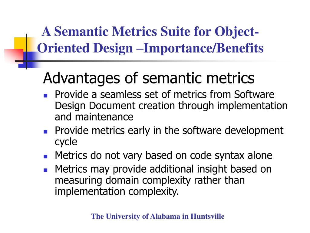 A Semantic Metrics Suite for Object-Oriented Design –Importance/Benefits Advantages of semantic metrics • Provide a seamless set of metrics from Software Design Document creation through implementation and maintenance • Provide metrics early in the software development cycle • Metrics do not vary based on code syntax alone • Metrics may provide additional insight based on measuring domain complexity rather than implementation complexity. The University of Alabama in Huntsville