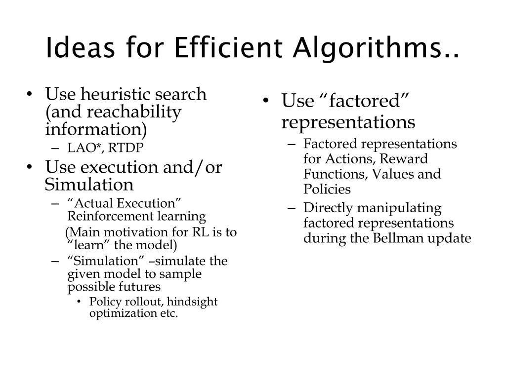 Use heuristic search (and reachability information) LAO*, RTDP Use execution and/or Simulation “Actual Execution” Reinforcement learning (Main motivation for RL is to “learn” the model) “Simulation” –simulate the given model to sample possible futures Policy rollout, hindsight optimization etc. Use “factored” representations Factored representations for Actions, Reward Functions, Values and Policies Directly manipulating factored representations during the Bellman update Ideas for Efficient Algorithms..