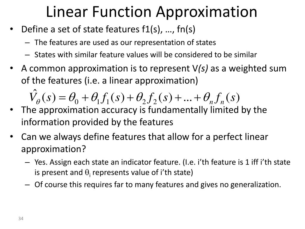 Linear Function Approximation • Define a set of state features f1(s), …, fn(s) • The features are used as our representation of states • States with similar feature values will be considered to be similar • A common approximation is to represent V(s) as a weighted sum of the features (i.e. a linear approximation) • The approximation accuracy is fundamentally limited by the information provided by the features • Can we always define features that allow for a perfect linear approximation? • Yes. Assign each state an indicator feature. (I.e. i’th feature is 1 iff i’th state is present and i represents value of i’th state) • Of course this requires far to many features and gives no generalization.