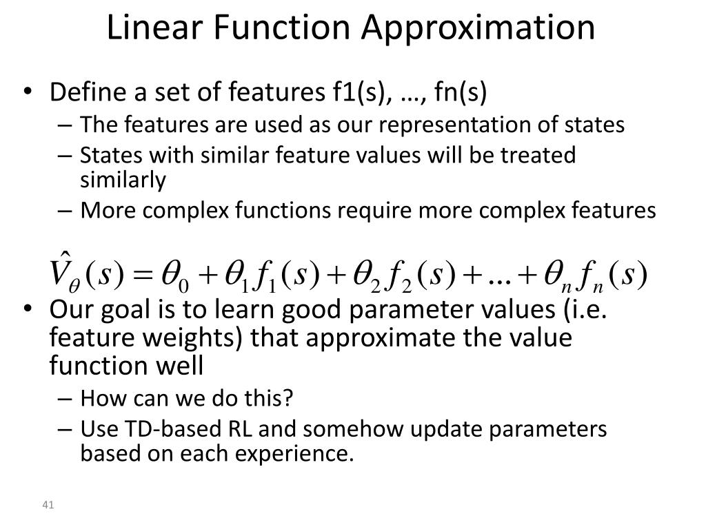 Linear Function Approximation • Define a set of features f1(s), …, fn(s) • The features are used as our representation of states • States with similar feature values will be treated similarly • More complex functions require more complex features • Our goal is to learn good parameter values (i.e. feature weights) that approximate the value function well • How can we do this? • Use TD-based RL and somehow update parameters based on each experience.