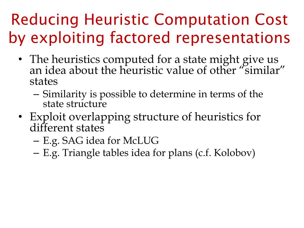 Reducing Heuristic Computation Cost by exploiting factored representations • The heuristics computed for a state might give us an idea about the heuristic value of other “similar” states • Similarity is possible to determine in terms of the state structure • Exploit overlapping structure of heuristics for different states • E.g. SAG idea for McLUG • E.g. Triangle tables idea for plans (c.f. Kolobov)