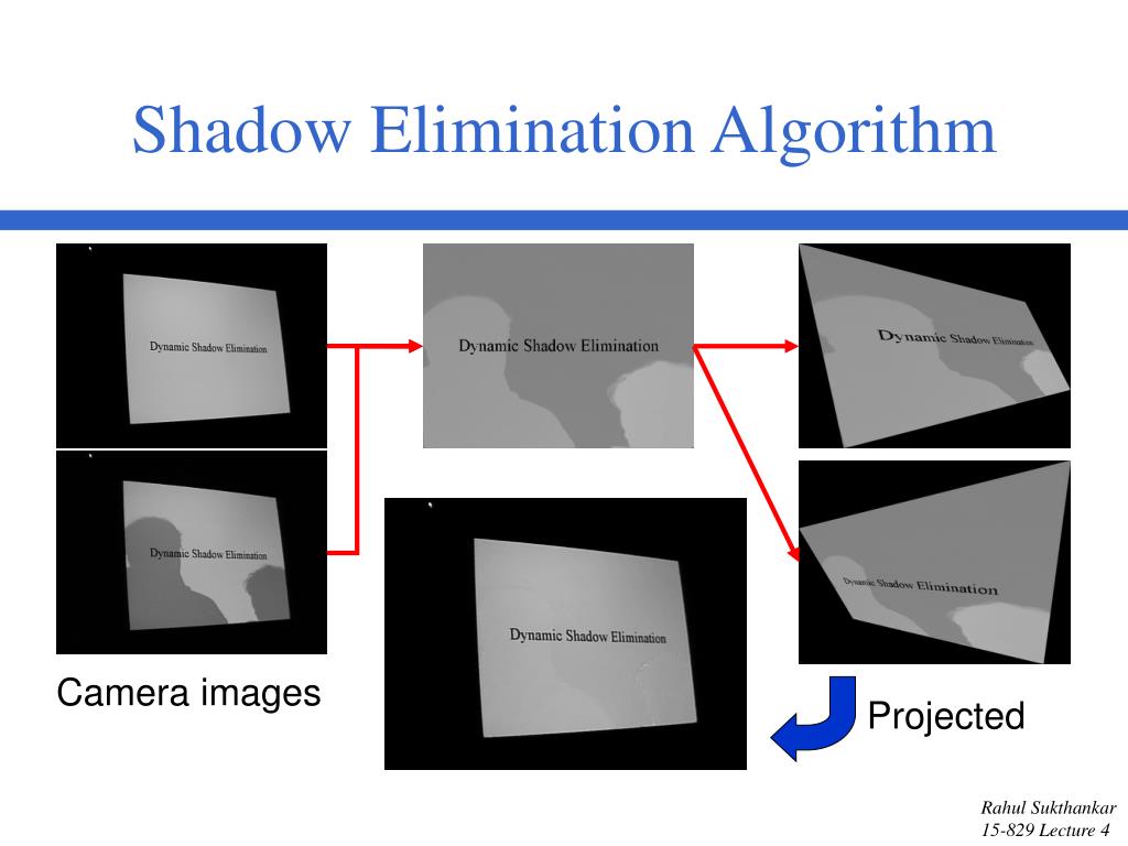 display screen camera P-1 P-2 Shadow Elimination: Challenges • Occlusion detection: what does a shadow look like? • Geometric issues: which projectors are occluded? • Photometric issues: how much light removes a shadow? • Performance: how can we do this in near real-time?