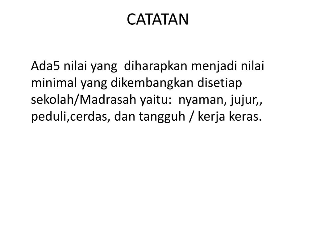 CATATAN Ada5 nilai yang diharapkan menjadi nilai minimal yang dikembangkan disetiap sekolah/Madrasah yaitu: nyaman, jujur,, peduli,cerdas, dan tangguh / kerja keras.