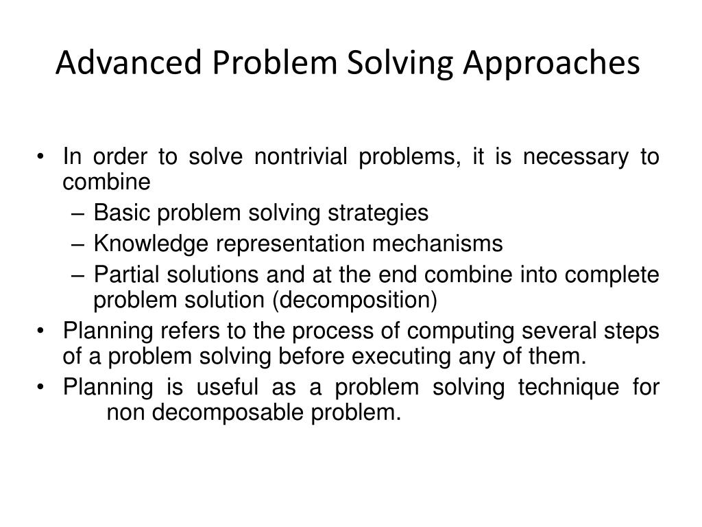 Advanced Problem Solving Approaches • In order to solve nontrivial problems, it is necessary to combine • Basic problem solving strategies • Knowledge representation mechanisms • Partial solutions and at the end combine into complete problem solution (decomposition) • Planning refers to the process of computing several steps of a problem solving before executing any of them. • Planning is useful as a problem solving technique for non decomposable problem.
