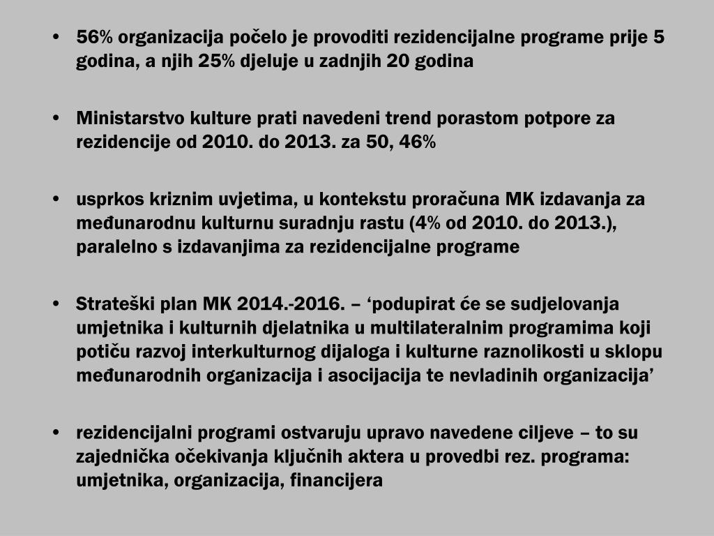 56% organizacija počelo je provoditi rezidencijalne programe prije 5 godina, a njih 25% djeluje u zadnjih 20 godina • Ministarstvo kulture prati navedeni trend porastom potpore za rezidencije od 2010. do 2013. za 50, 46% • usprkos kriznim uvjetima, u kontekstu proračuna MK izdavanja za međunarodnu kulturnu suradnju rastu (4% od 2010. do 2013.), paralelno s izdavanjima za rezidencijalne programe • Strateški plan MK 2014.-2016. – ‘podupirat će se sudjelovanja umjetnika i kulturnih djelatnika u multilateralnim programima koji potiču razvoj interkulturnog dijaloga i kulturne raznolikosti u sklopu međunarodnih organizacija i asocijacija te nevladinih organizacija’ • rezidencijalni programi ostvaruju upravo navedene ciljeve – to su zajednička očekivanja ključnih aktera u provedbi rez. programa: umjetnika, organizacija, financijera