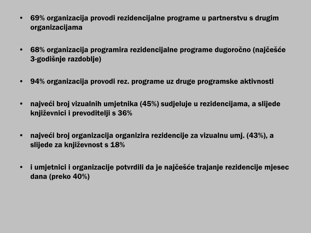 69% organizacija provodi rezidencijalne programe u partnerstvu s drugim organizacijama • 68% organizacija programira rezidencijalne programe dugoročno (najčešće 3-godišnje razdoblje) • 94% organizacija provodi rez. programe uz druge programske aktivnosti • najveći broj vizualnih umjetnika (45%) sudjeluje u rezidencijama, a slijede književnici i prevoditelji s 36% • najveći broj organizacija organizira rezidencije za vizualnu umj. (43%), a slijede za književnost s 18% • i umjetnici i organizacije potvrdili da je najčešće trajanje rezidencije mjesec dana (preko 40%)