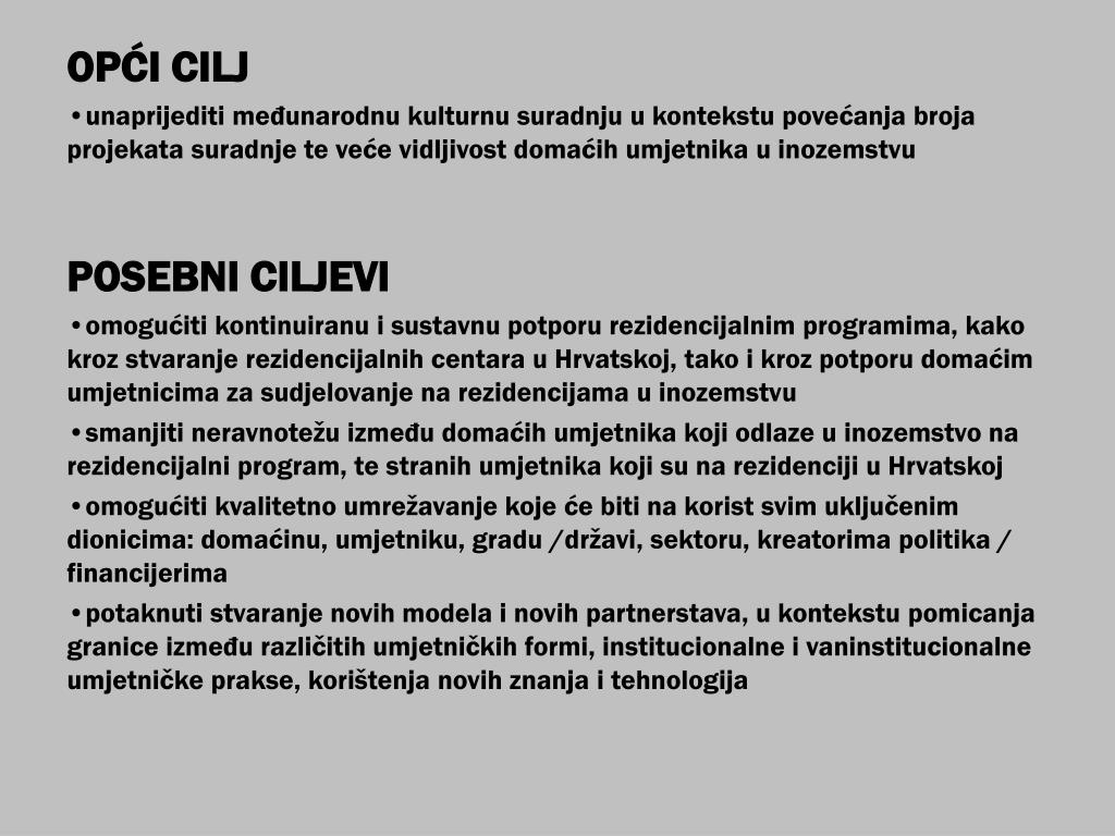 OPĆI CILJ • unaprijediti međunarodnu kulturnu suradnju u kontekstu povećanja broja projekata suradnje te veće vidljivost domaćih umjetnika u inozemstvu POSEBNI CILJEVI • omogućiti kontinuiranu i sustavnu potporu rezidencijalnim programima, kako kroz stvaranje rezidencijalnih centara u Hrvatskoj, tako i kroz potporu domaćim umjetnicima za sudjelovanje na rezidencijama u inozemstvu • smanjiti neravnotežu između domaćih umjetnika koji odlaze u inozemstvo na rezidencijalni program, te stranih umjetnika koji su na rezidenciji u Hrvatskoj • omogućiti kvalitetno umrežavanje koje će biti na korist svim uključenim dionicima: domaćinu, umjetniku, gradu /državi, sektoru, kreatorima politika / financijerima • potaknuti stvaranje novih modela i novih partnerstava, u kontekstu pomicanja granice između različitih umjetničkih formi, institucionalne i vaninstitucionalne umjetničke prakse, korištenja novih znanja i tehnologija
