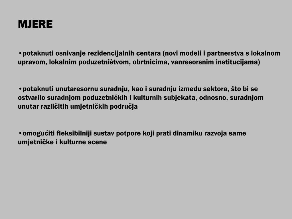 MJERE • potaknuti osnivanje rezidencijalnih centara (novi modeli i partnerstva s lokalnom upravom, lokalnim poduzetništvom, obrtnicima, vanresorsnim institucijama) • potaknuti unutaresornu suradnju, kao i suradnju između sektora, što bi se ostvarilo suradnjom poduzetničkih i kulturnih subjekata, odnosno, suradnjom unutar različitih umjetničkih područja • omogućiti fleksibilniji sustav potpore koji prati dinamiku razvoja same umjetničke i kulturne scene