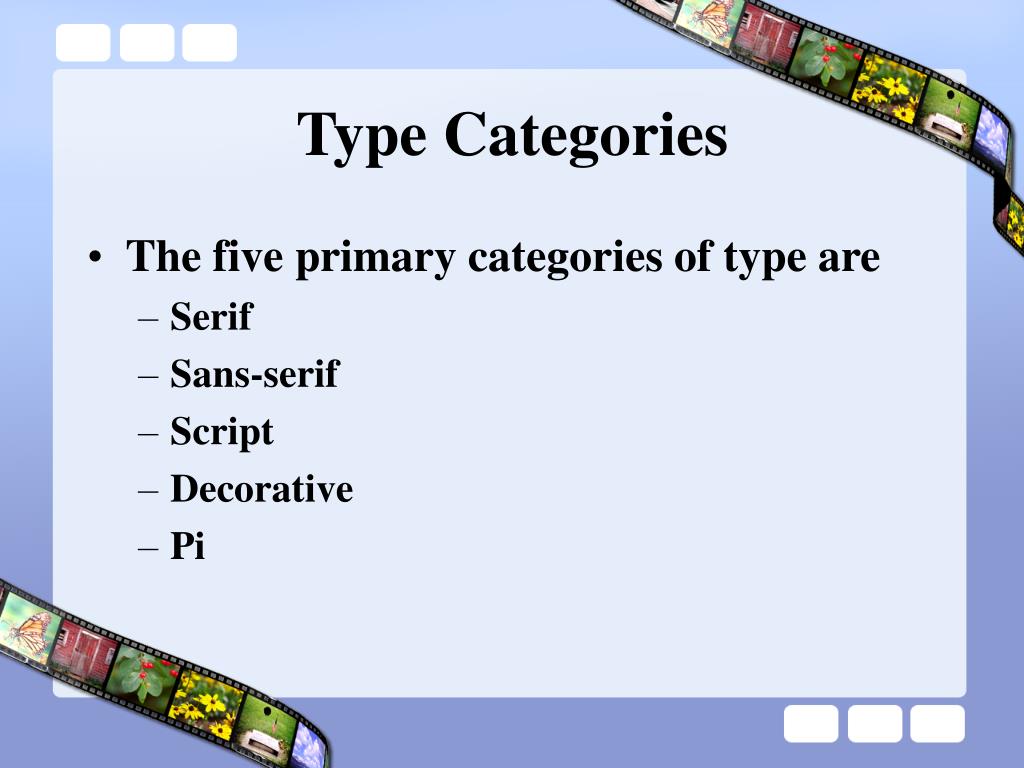 Type Categories • The five primary categories of type are • Serif • Sans-serif • Script • Decorative • Pi