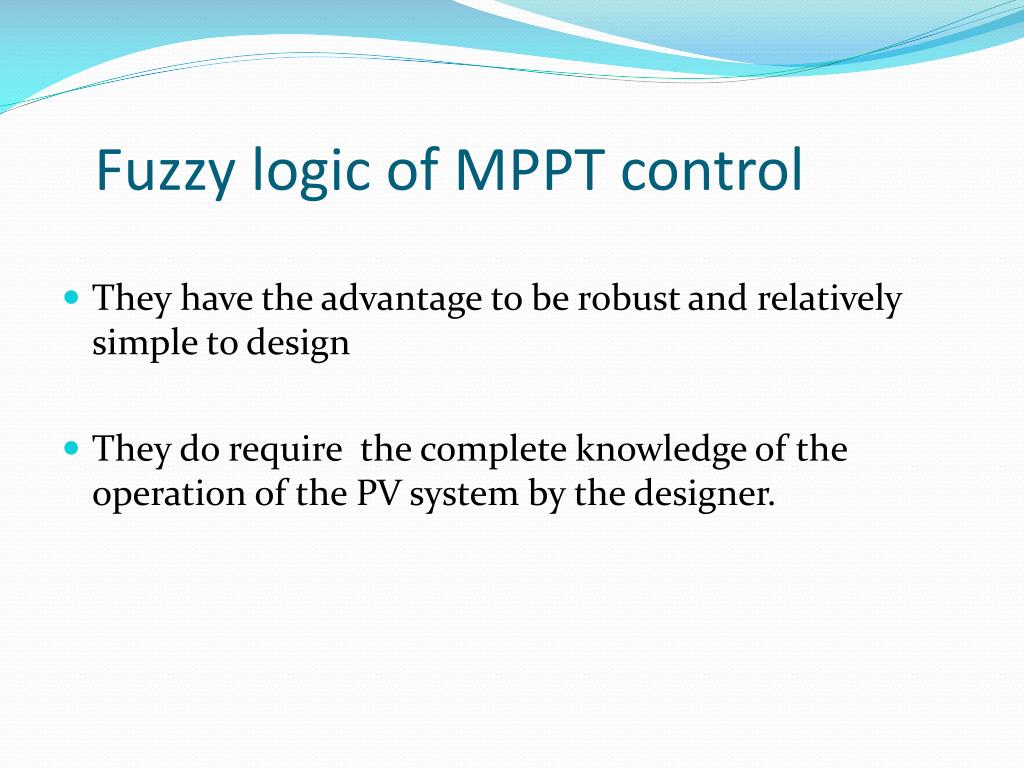 Fuzzy logic of MPPT control • They have the advantage to be robust and relatively simple to design • They do require the complete knowledge of the operation of the PV system by the designer.