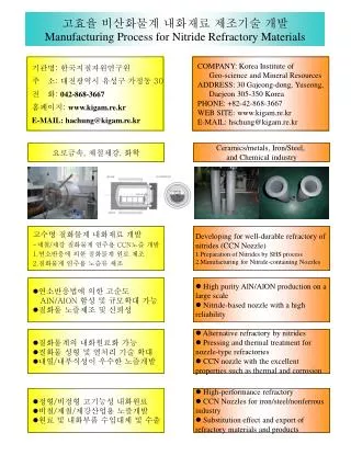 고효율 비산화물계 내화재료 제조기술 개발 Manufacturing Process for Nitride Refractory Materials. 기관명 : 한국지질자원연구원 주 소 : 대전광역시 유성구 가정동 30 전 화 : 042-868-3667 홈페이지 : www.kigam.re.kr E-MAIL: hachung@kigam.re.kr. COMPANY: Korea Institute of Geo-science and Mineral Resources