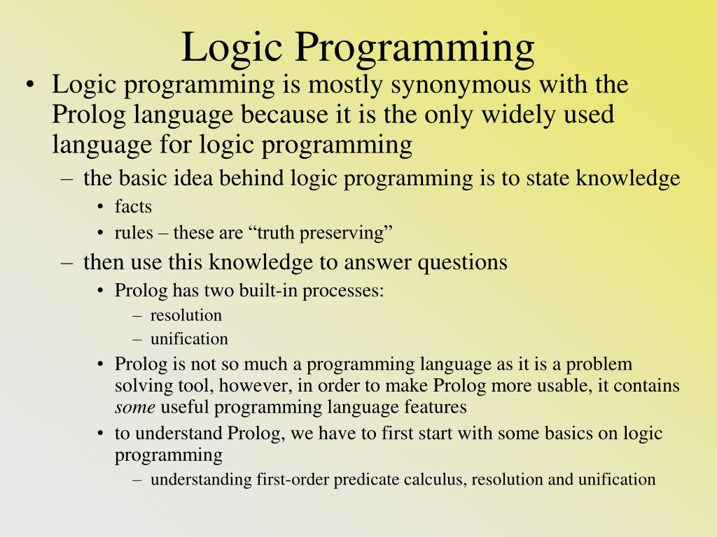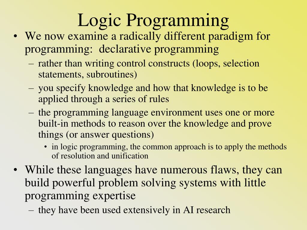 Logic Programming. We now examine a radically different paradigm for programming: declarative programming rather than writing control constructs (loops, selection statements, subroutines) you specify knowledge and how that knowledge is to be applied through a series of rules