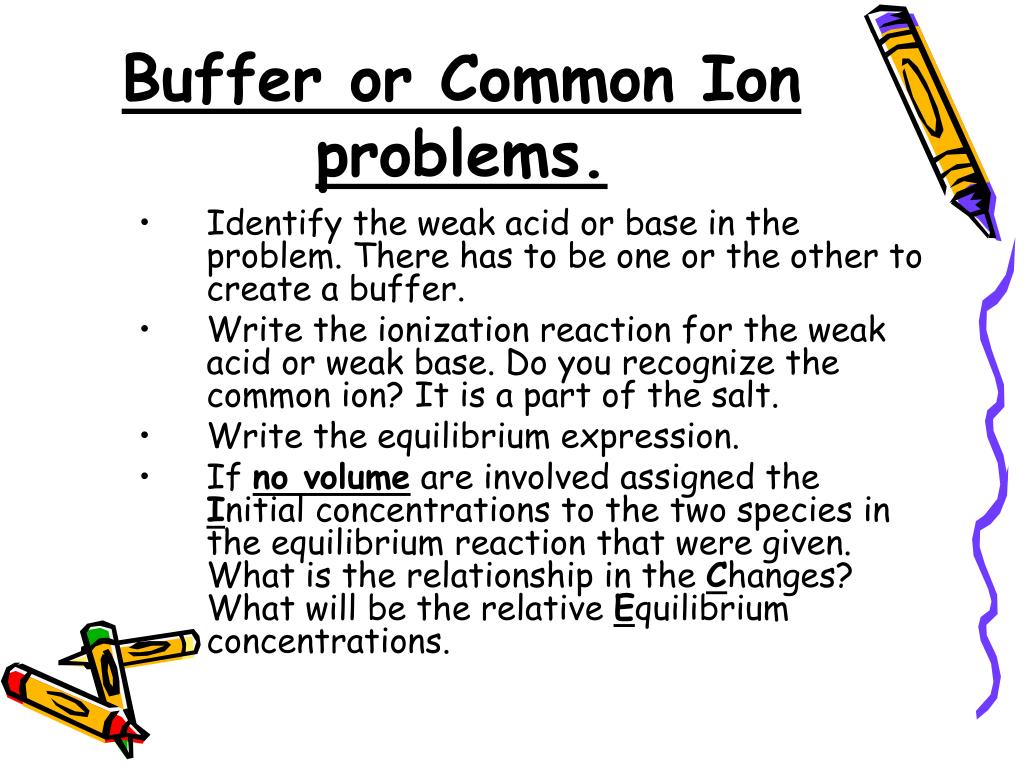 Buffer or Common Ion problems. • If Volumes are given the initial concentrations will change when the solutions are added. You must calculate the changes using M1V1 = M2V2. • Test for the need to use the quadratic equation. Assign the Equilibrium concentrations in the equilibrium expression and solve for the unknown. • Find the information requested in the problem. Most likely a pH value.