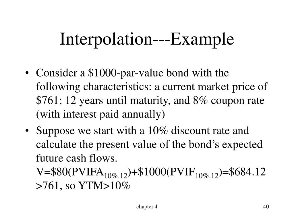 Interpolation---Example • Consider a $1000-par-value bond with the following characteristics: a current market price of $761; 12 years until maturity, and 8% coupon rate (with interest paid annually) • Suppose we start with a 10% discount rate and calculate the present value of the bond’s expected future cash flows. V=$80(PVIFA10%.12)+$1000(PVIF10%.12)=$684.12>761, so YTM>10% chapter 4