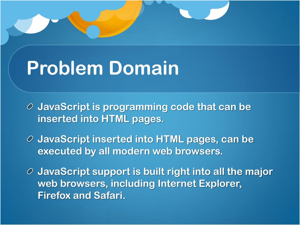 Problem Domain • JavaScript is programming code that can be inserted into HTML pages. • JavaScript inserted into HTML pages, can be executed by all modern web browsers. • JavaScript support is built right into all the major web browsers, including Internet Explorer, Firefox and Safari.