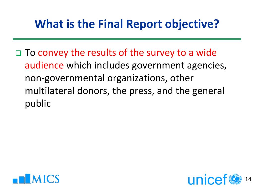 What is the Final Report objective? • To convey the results of the survey to a wide audience which includes government agencies, non-governmental organizations, other multilateral donors, the press, and the general public