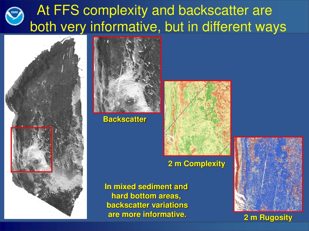At FFS complexity and backscatter are both very informative, but in different ways Backscatter 2 m Complexity In mixed sediment and hard bottom areas, backscatter variations are more informative. 2 m Rugosity