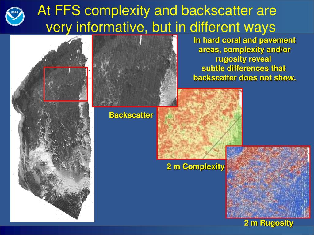 At FFS complexity and backscatter are very informative, but in different ways In hard coral and pavement areas, complexity and/or rugosity reveal subtle differences that backscatter does not show. Backscatter 2 m Complexity 2 m Rugosity