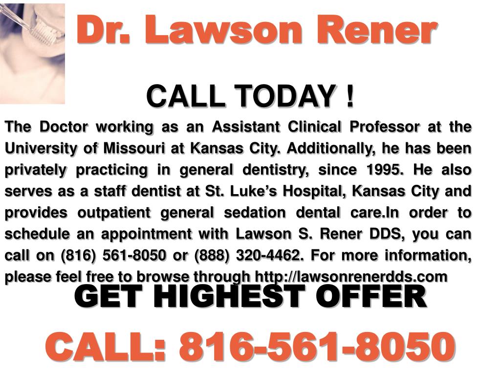 Dr. Lawson Rener CALL TODAY ! The Doctor working as an Assistant Clinical Professor at the University of Missouri at Kansas City. Additionally, he has been privately practicing in general dentistry, since 1995. He also serves as a staff dentist at St. Luke’s Hospital, Kansas City and provides outpatient general sedation dental care.In order to schedule an appointment with Lawson S. Rener DDS, you can call on (816) 561-8050 or (888) 320-4462. For more information, please feel free to browse through http://lawsonrenerdds.com GET HIGHEST OFFER CALL: 816-561-8050