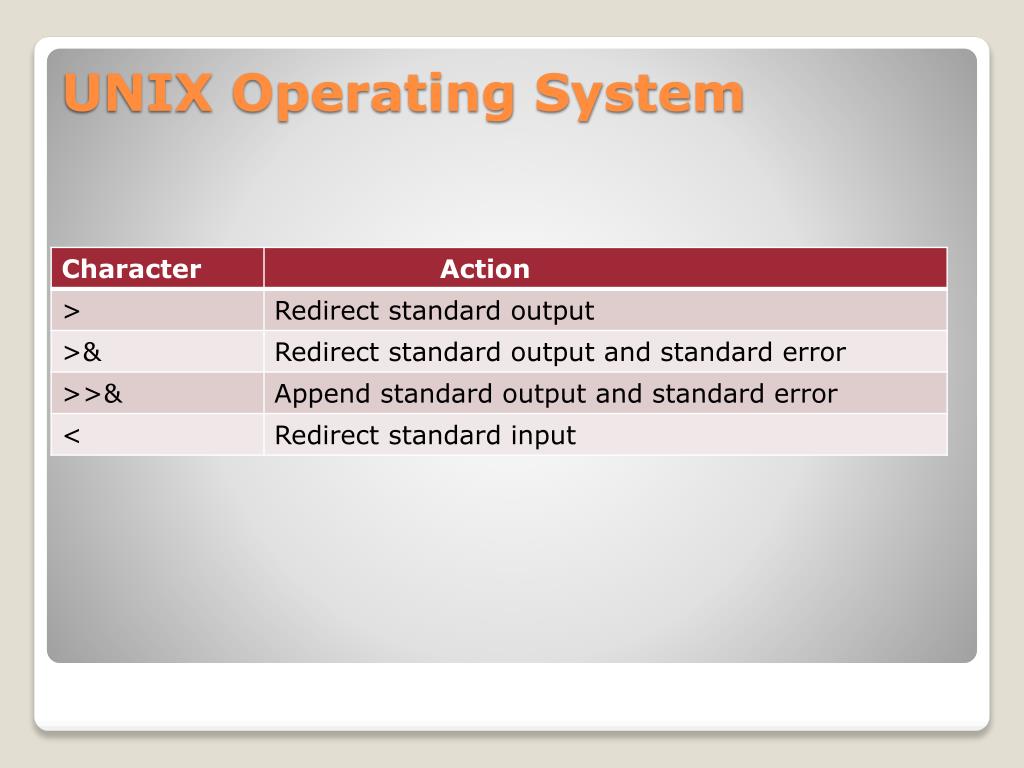 Shell redirect ls–a > /tmp/output 2>&1 (stderr redirected to stdout) > is equivalent to 1> (stdout (write) redirect symbol)) < is equivalent to <0 (stdin (read) redirect symbol) UNIX Operating System