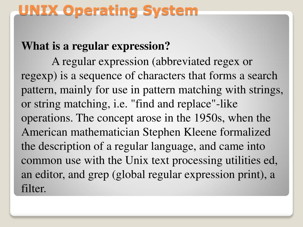 What is a regular expression? A regular expression (abbreviated regex or regexp) is a sequence of characters that forms a search pattern, mainly for use in pattern matching with strings, or string matching, i.e. "find and replace"-like operations. The concept arose in the 1950s, when the American mathematician Stephen Kleene formalized the description of a regular language, and came into common use with the Unix text processing utilities ed, an editor, and grep (global regular expression print), a filter. UNIX Operating System